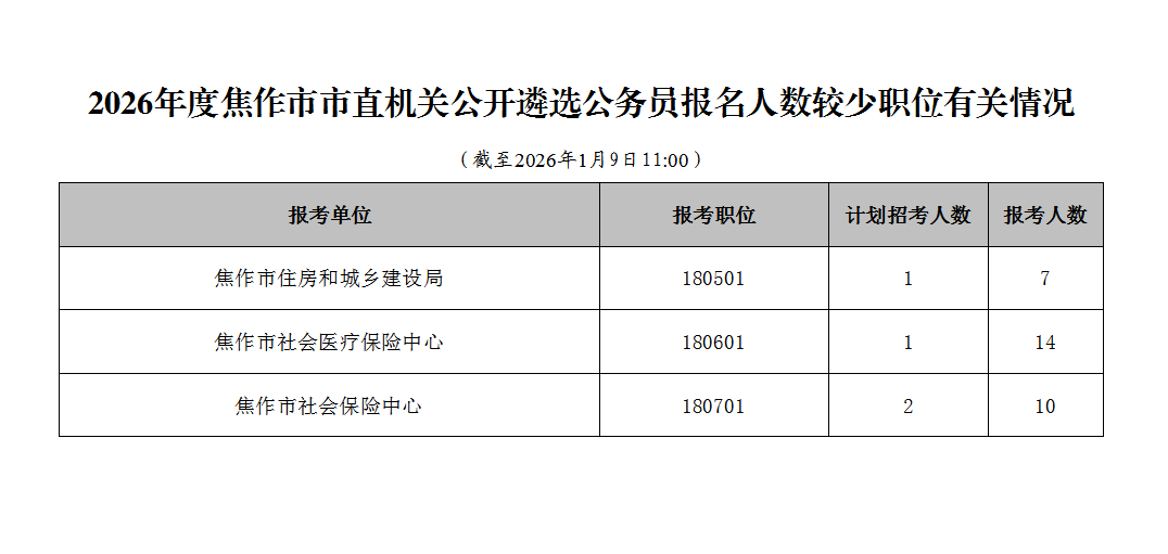 截至1月9日11:00,2026年度焦作市市直机关公开遴选公务员的报名总人数为238人,现公布报名人数较少职位的有关情况。本次遴选报名有关情况仅通过焦作党建网公布,请报考者予以关注,理性审慎选择职位,避免被虚假信息误导。