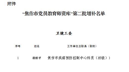根据《关于建立第二批焦作市党员教育师资库的通知》要求,经单位推荐、审核筛选等环节,确定杨婷宇同志为第二批“焦作市党员教育师资库”增补人选,现将有关情况予以公示。任何单位和个人若有异议,可于公示期间通过来电、信函、来访等形式向焦作市委党员教育中心反映。