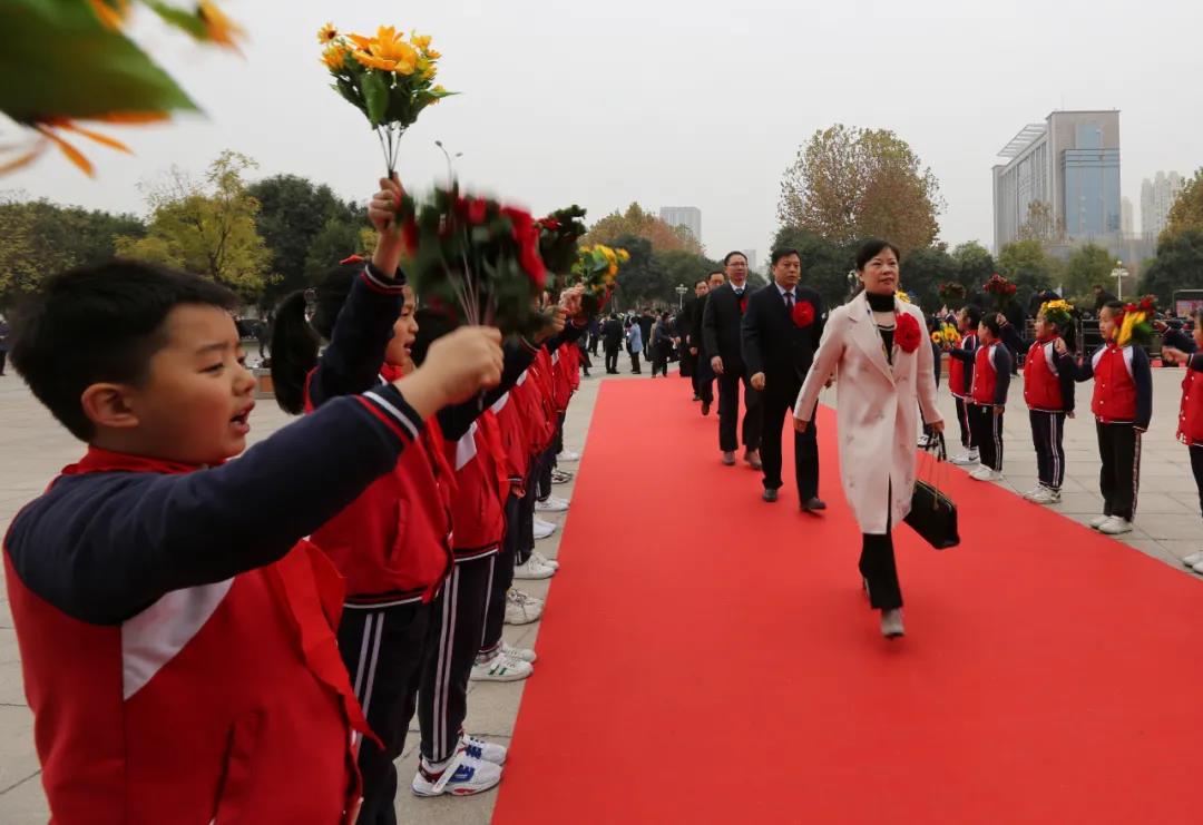8时45分,与市领导合影留念的受表彰代表胸戴红花,神采奕奕踏上红地毯,少先队员热情欢呼致意。代表们沿红地毯拾级而上,进入会场。