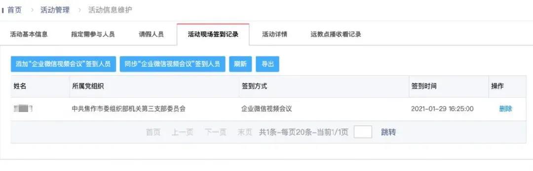 视频会议结束后,系统每天夜间自动同步参会人员到活动签到人员中,并标记签到方式为“企业微信视频会议”,也可点击“同步企业微信视频会议签到人员”进行手动立即同步,如下图所示:
