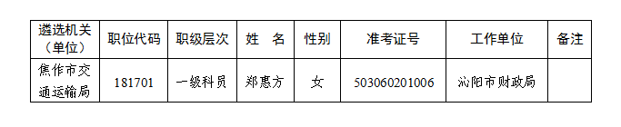 根据2025年度焦作市市直机关公开遴选公务员工作有关要求,经过笔试、面试、考察、体检等程序,确定郑惠方为焦作市公开遴选拟任职人员,现予以公示。